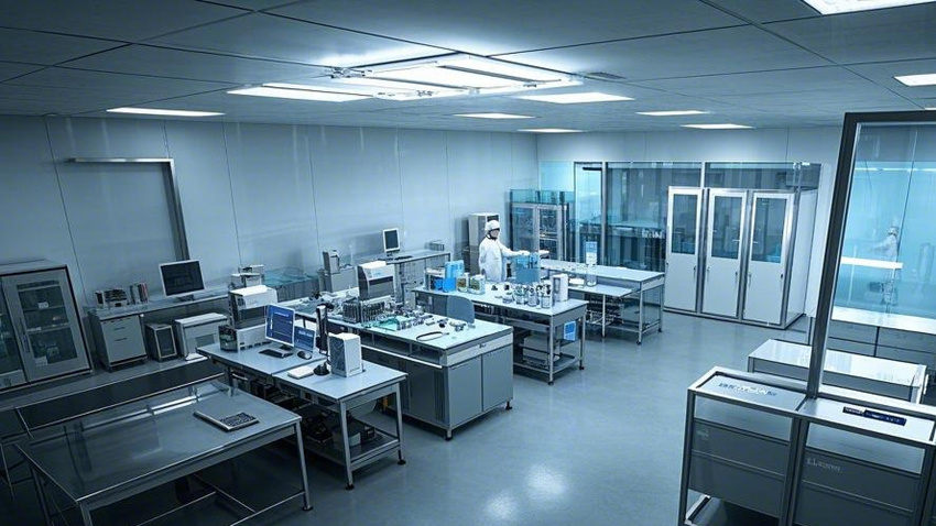 1000平方米電子無塵車間,現代科技風格,干凈整潔,光線明亮。核心生產區占70%,輔助區占20%,辦公區占10%。核心生產區:防靜電環氧地坪(淺灰色),白色彩鋼板墻面和天花板,垂直層流氣流,頂部高效過濾器(HEPA),不銹鋼工作臺,設備排列整齊。輔助區:更衣室(淺藍色墻面,衣柜和長凳),風淋室(透明玻璃門,不銹鋼墻面),物料緩沖間(傳遞窗,白色墻面)。辦公區:玻璃隔斷,現代簡約辦公桌,防靜電PVC地板(淺色),LED面板燈。整體色彩:白色、淺灰色、科技藍點綴。